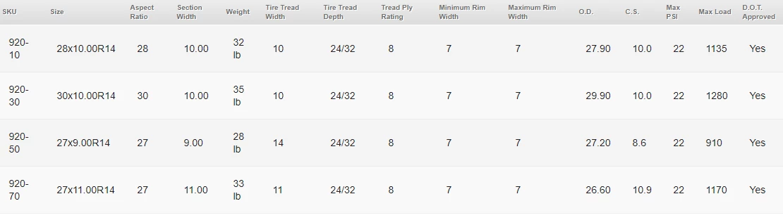 | 920-30 | 30×10.00R14 | 35 lb | 24/32 | 8 | 7″ | 22 | 1280 | Yes |